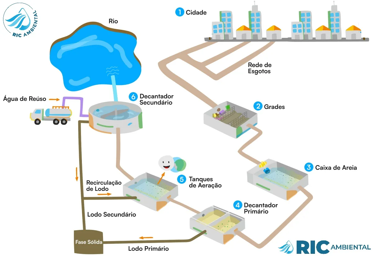 Após o tratamento, o efluente tratado é devolvido ao meio ambiente (geralmente a corpos hídricos) de forma segura, respeitando os parâmetros legais de qualidade. Os resíduos sólidos gerados durante o processo (lodo) são encaminhados para aterros sanitários ou reutilizados, conforme viabilidade técnica.